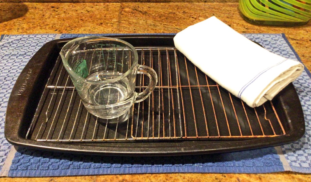 Heat oven to 475 degrees. Scrub unshucked oysters well to remove any sand. Arrange oysters in a single layer in a 12-by-16-inch roasting pan fitted with a flat rack. Pour 1/3 inch of hot tap water into pan. Cover the oysters with clean very damp dishcloth or kitchen towel. Bake for 7 minutes, or until oyster shells have begun to open.