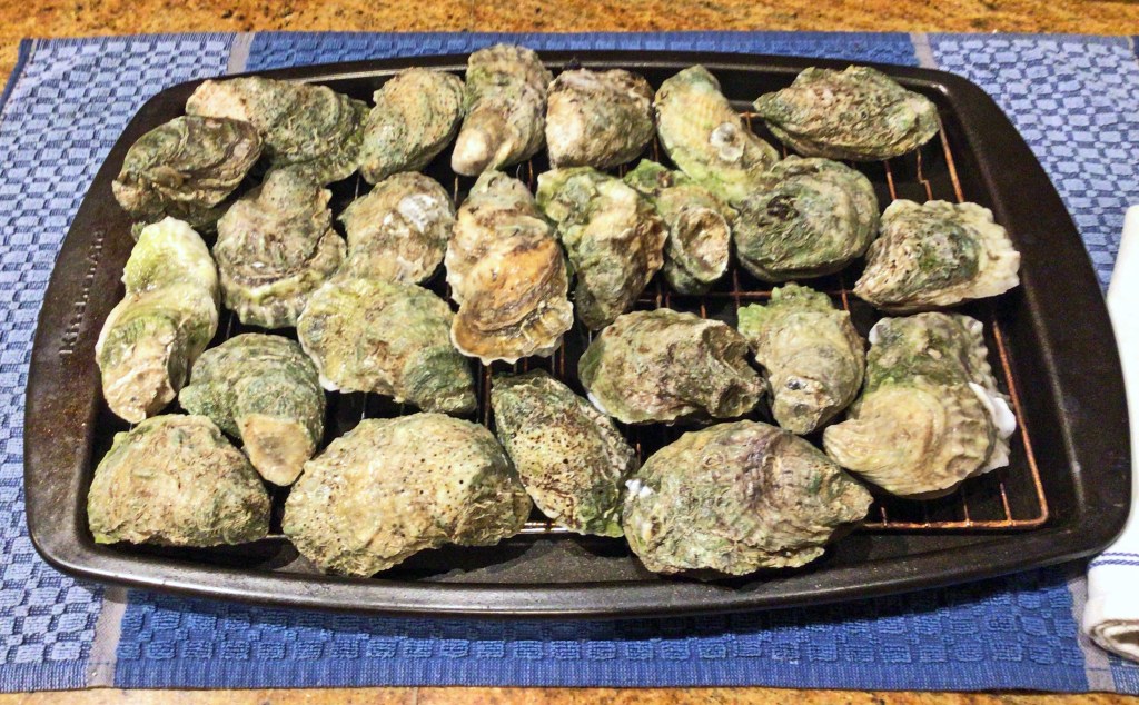 I grew up eating lots of oysters. Daddy and Grandaddy had a secret spot somewhere on the Matanzas river north of where we lived. They would roast them on a rack over an open fire with wet gunny sacks over them to make them steam open. Stan did NOT grow up eating them. A few years ago a friend said she put raw oysters in a plate with a damp towel over them and microwaved them for about 3 minutes until they steamed open. Well, that was ok, but i wanted more then six or eight oysters. It finally came to me that I could basically do the same thing in the oven with lots more oysters!